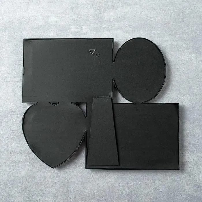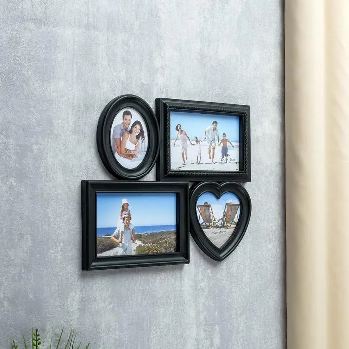 Создавайте тематические серии из фото и периодически их меняйте. Фоторамка-коллаж на 4 фото 10×15, 9×9, 6.5×9 см «Мультирамка», пластик, чёрная, 25.5×30 см — отличная возможность не ограничиваться вставкой одной фотографии, а одновременно разместить несколько дорогих сердцу снимков.