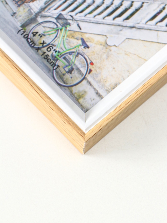 - Классическая двухцветная палитра: Сочетание бежевого «под бук» и белого создает спокойную и теплую атмосферу. Такая рамка становится нейтральным украшением, которое не конфликтует с окружающим декором.