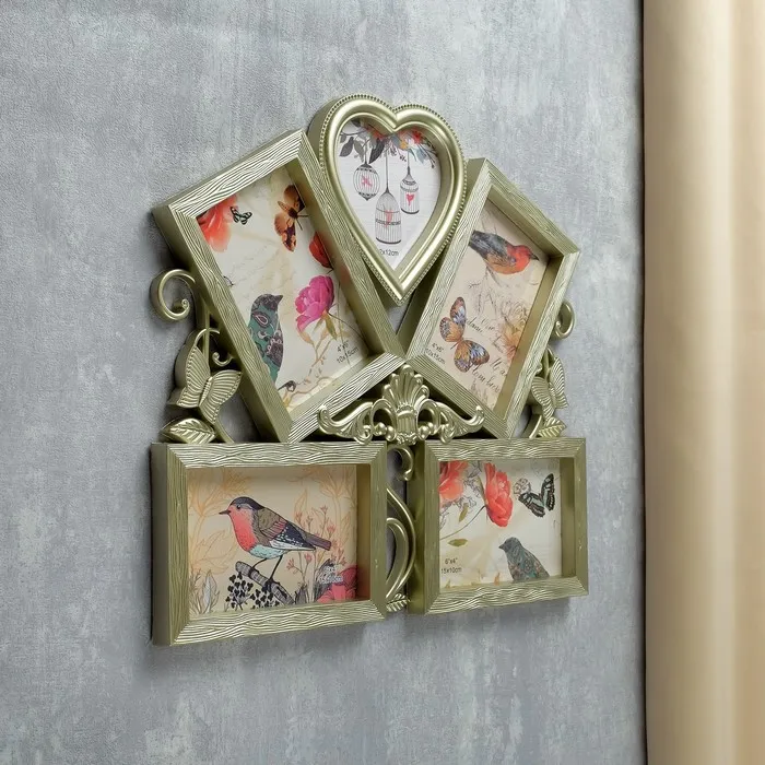 Фоторамка-коллаж на 5 фото 10×15, 12×12 см «Бабочки и вензель», пластик, мультирамка, золото, 34.5×37 см — Характеристики