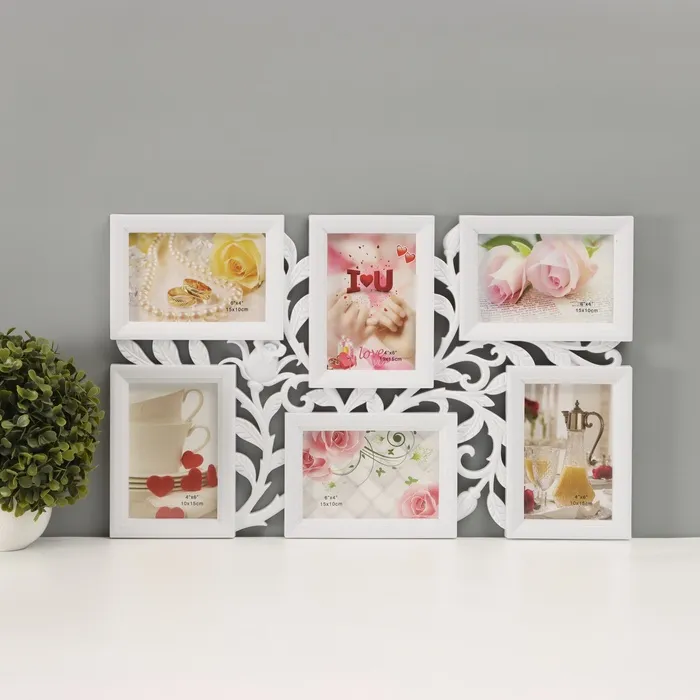 Ломаете голову над тем, что подарить своей второй половине, в День святого Валентина? Представляем Вам фоторамку-коллаж - это универсальный и неповторимый подарок, уместный для любого повода. Коллаж на стену необязательно кому-то дарить, ведь Вы можете порадовать покупкой и самого себя. Просто сделайте подборку из лучших и любимых фотографий и разместите их в фоторамках. Вы можете создать тематические серии из фото и периодически их менять. Фоторамка-коллаж на 6 фото 10×15 см «Бутон», пластик, белая, 52×32 см - отличная возможность не ограничиваться вставкой одного фото, а разместить можно одновременно несколько дорогих сердцу снимков.