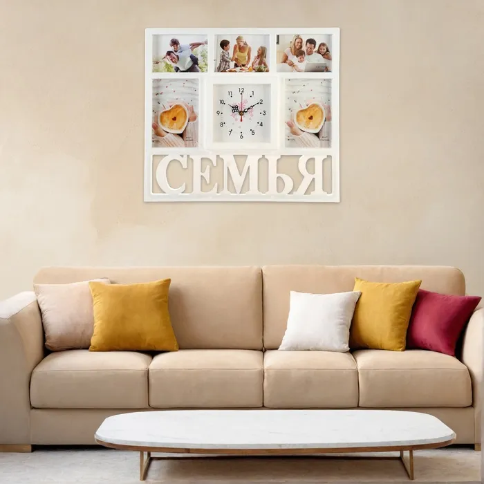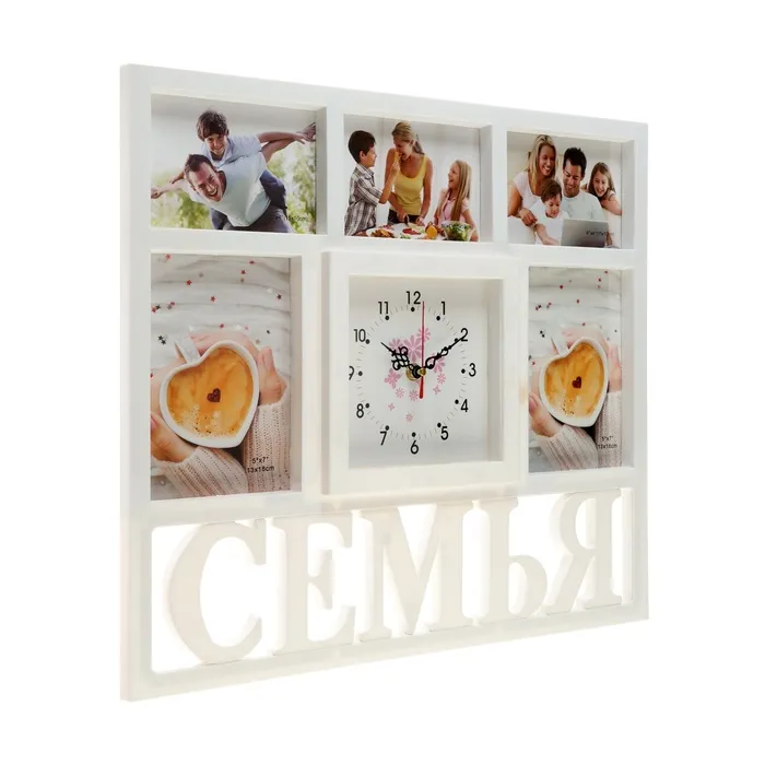 Настенные часы с фоторамками - оригинальный подарок, который никого не оставит равнодушным. Эти часы настоящая находка для тех, кто ценит качество и неповторимый дизайн. Настенные часы - это не только функциональный предмет, но и настоящий декоративный аксессуар, они разнообразят интерьер любой спальни или гостиной, подчеркнут стиль и гармонию вашего дома. Вместе с часами идут 5 рамок для фотографий, сделайте подборку из лучших и любимых фотографий, которые будут напоминать вам о каком-то приятном моменте вашей жизни.