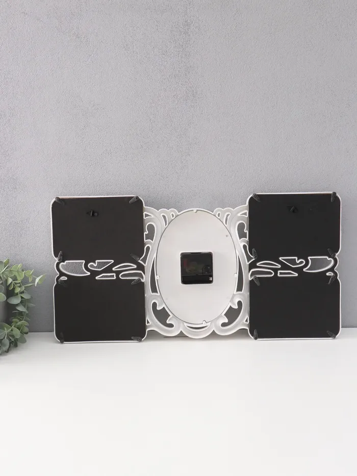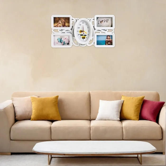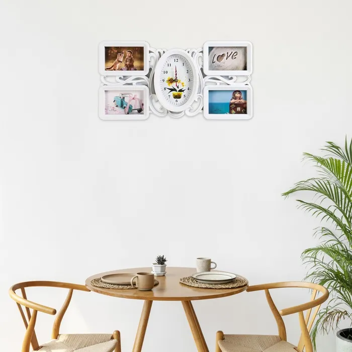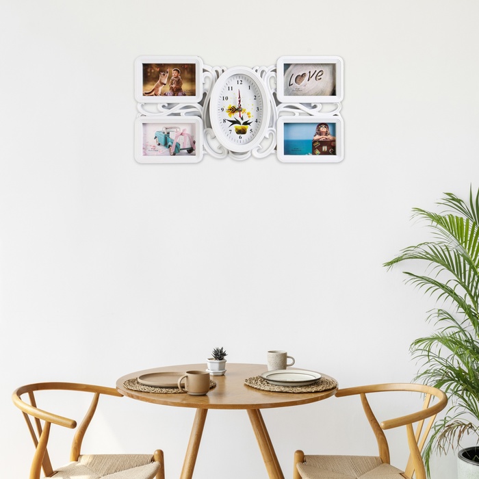 Фоторамка-коллаж с часами «Цветок» — это стильное и универсальное решение для украшения вашего интерьера. На её фоне белой пластиковой конструкции вы сможете разместить до четырёх фотографий 10 х 15 см, создавая уютную семейную атмосферу. Центром композиции служат встроенные часы с дробными арабскими цифрами, подчёркивающими изысканность дизайна.