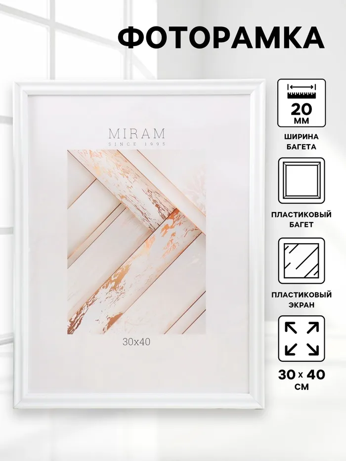 Фоторамка пластик "МИРАМ" 30х40 см, 261 белый (пластиковый экран) — Характеристики