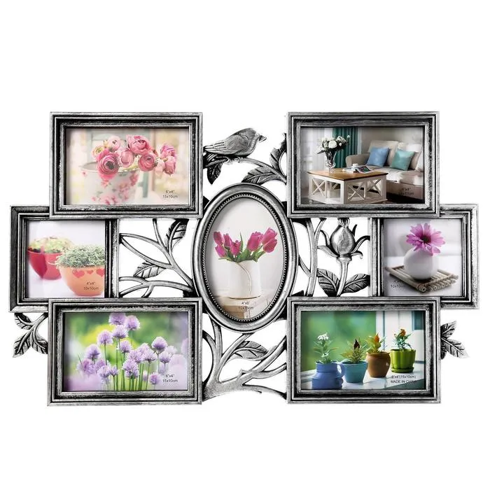 Фоторамка пластик на 7 фото 10х10, 10х15 см "Птица и шиповник" серебро 33,5х52 см — Характеристики
