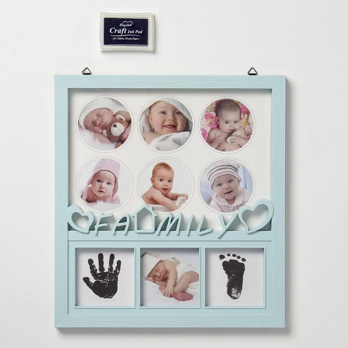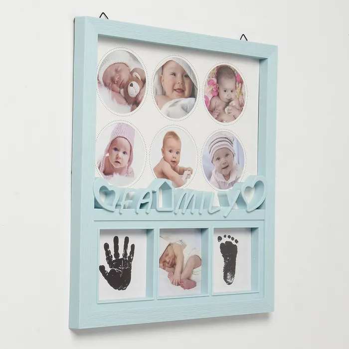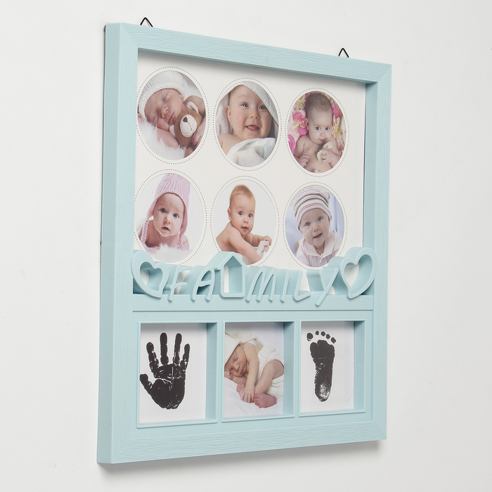 Фоторамка пластик на 7 фото 7х7, 8х8 см с штемп.подушкой "Семья" голубая 36х20 см — Характеристики