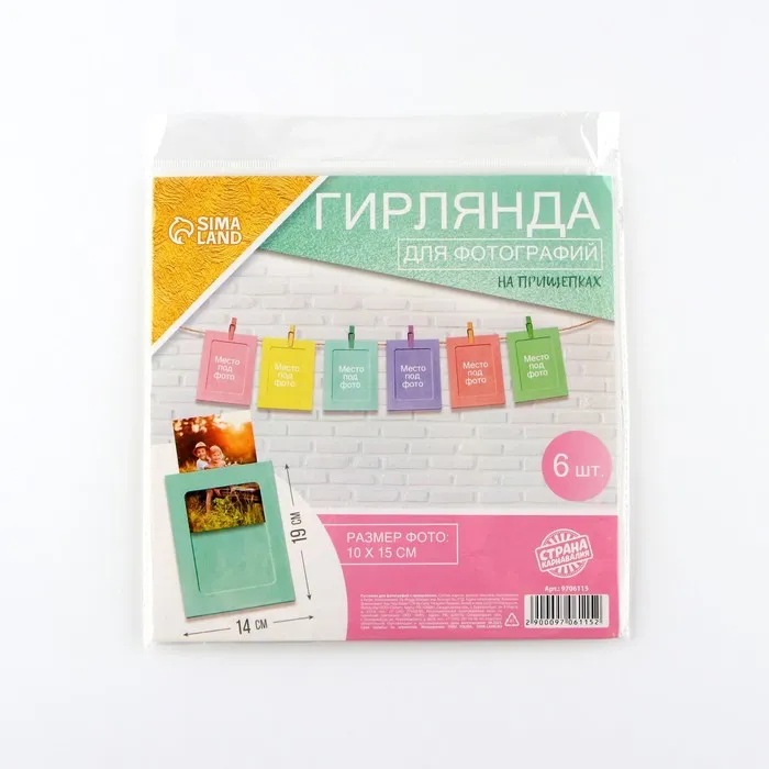 Создать соответствующее настроение дома или в офисе поможет оригинальная гирлянда! Она станет завершающим акцентом в интерьере. Декор легко подвесить на стену с помощью прищепок и веревки (входит в комплект). Вставьте любимые фотографии в элементы гирлянды и ваш дом наполнится яркими воспоминаниями. Размер места под фото 10 х 15 см.