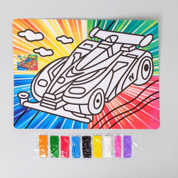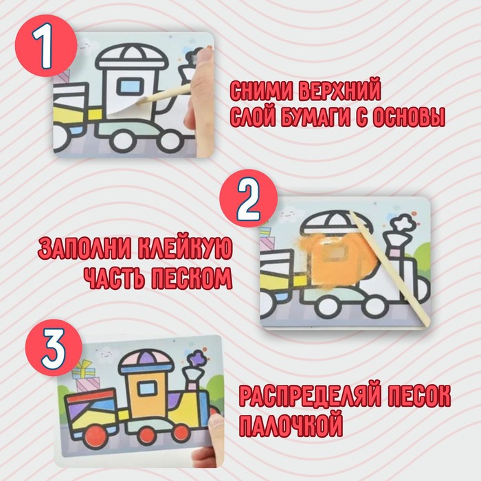 На бумажной основе есть белые области с клеевым слоем, который нужно посыпать цветным песком, ориентируясь на пример готовой картинки.