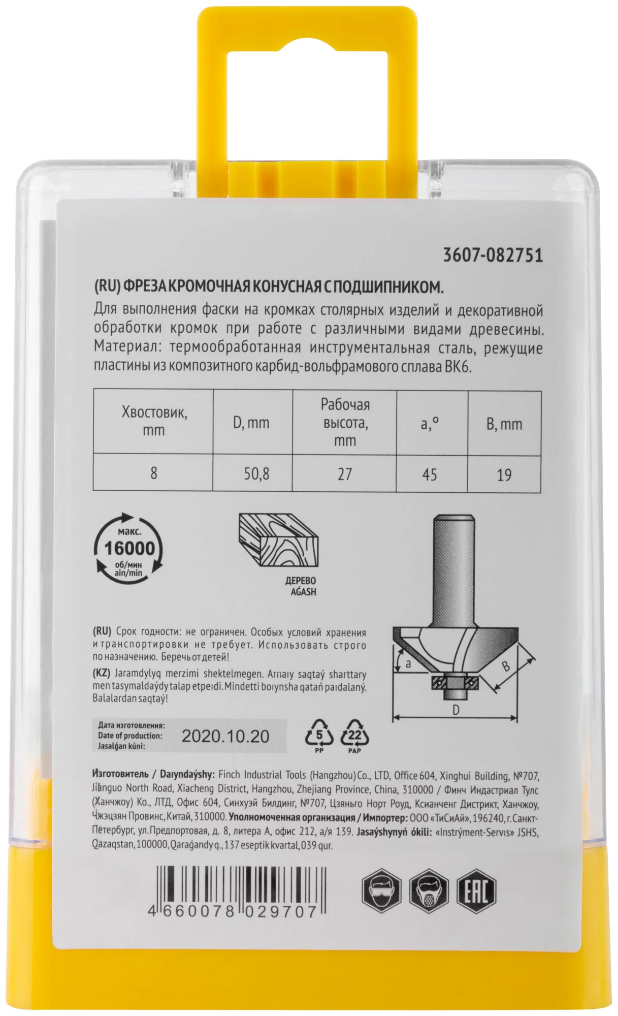 Фреза оснащена цилиндрическим хвостовиком диаметром 8 мм, что обеспечивает совместимость с большинством фрезеров. Изготовлена из инструментальной стали с твердосплавными режущими вставками, что гарантирует долговечность и устойчивость к износу. Угол при вершине 45° позволяет создавать четкие и аккуратные фаски.