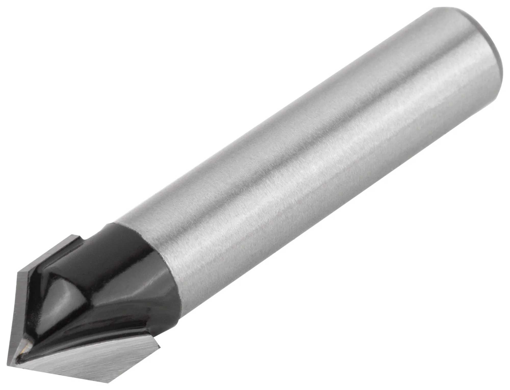 Фреза имеет угол при вершине 90°, что обеспечивает четкость и точность врезки. Изготовлена из инструментальной стали с твердосплавными режущими вставками, что гарантирует долговечность и высокую производительность. Цилиндрический хвостовик 8 мм обеспечивает надежную фиксацию.