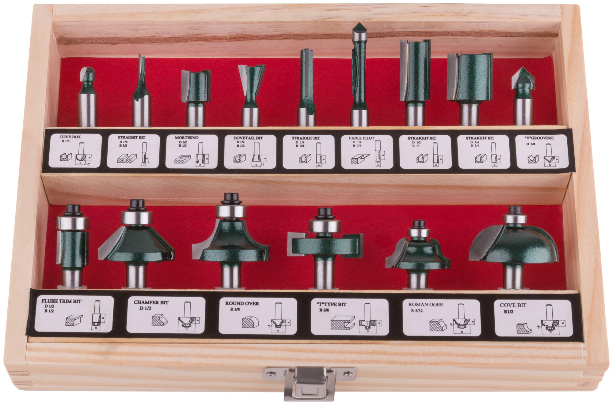 - 15 различных фрез в наборе — для разнообразия работ по дереву.