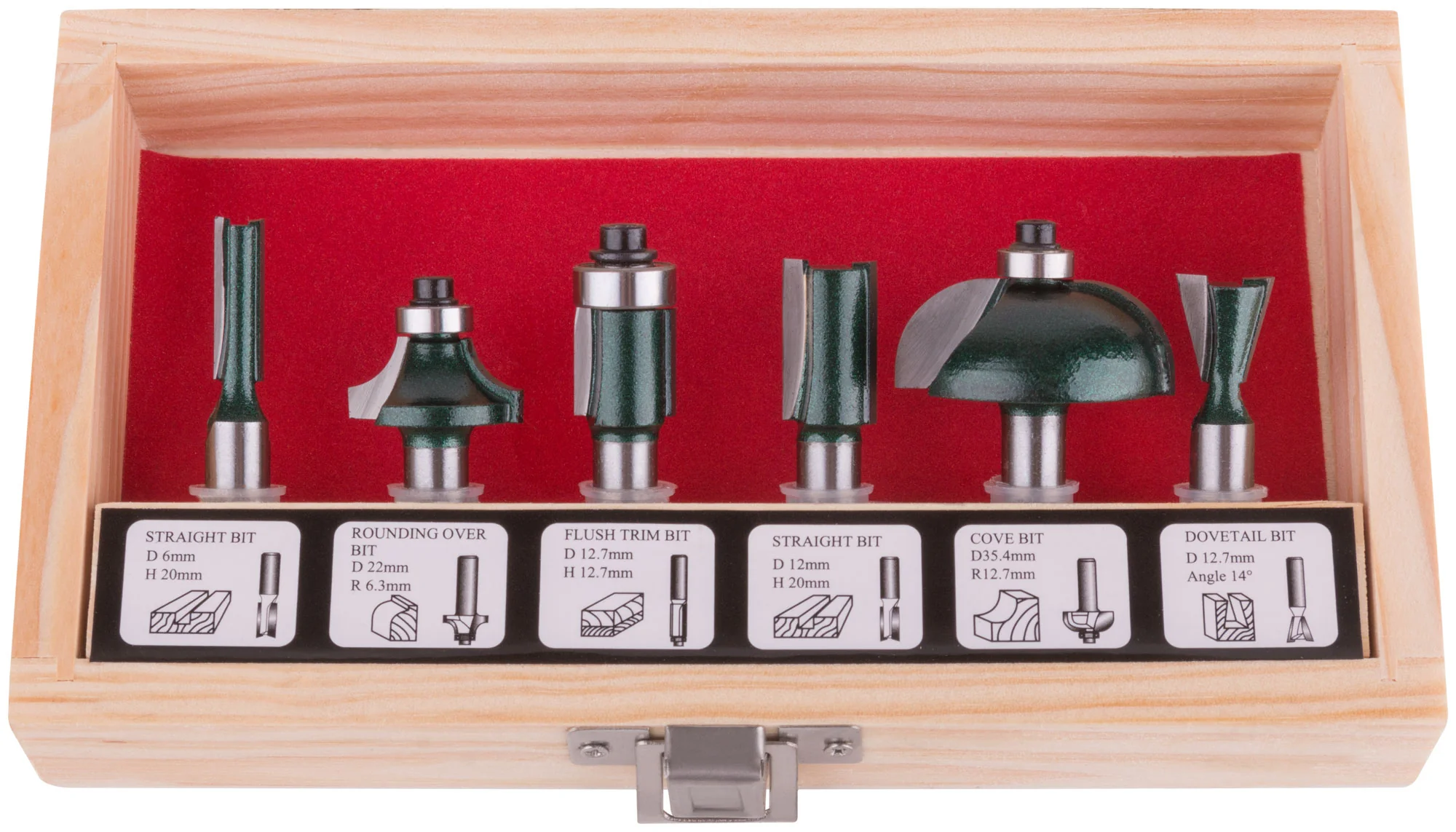 Фрезы изготовлены из инструментальной стали с твердосплавными режущими вставками, что обеспечивает их долговечность и отличное качество реза. Комплект поставляется в удобном деревянном боксе, который защищает фрезы от повреждений и позволяет хранить их в порядке.