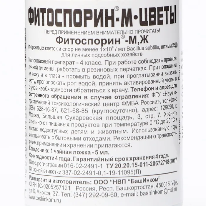 Фитоспорин-М-Цветы - это фунгицид на основе природной бактериальной культуры. Препарат применяют при следующих заболеваниях растений: парша, гнили всходов и корней, фузариоза, бурой ржавчины, черной ножки, а также против увядания, мучнистой росы, септориоза, фитофтороза и многих прочих заболеваний. Живая споровая бактериальная культура подавляет продуктами своей жизнедеятельности размножение многих грибных и бактериальных болезней растений, обладает свойством повышения иммунитета и стимуляции роста у растений, что важно для повышения их продуктивности и уменьшения повторных заражений.