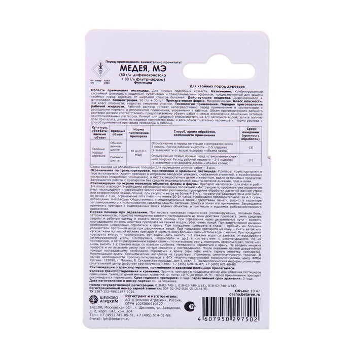 Фунгицид Медея, МЭ, представляет собой средство профилактического и лечебного действия, предназначенное для защиты хвойных пород от различных грибковых заболеваний. Препарат обладает широким спектром действия и эффективно борется с такими заболеваниями, как мучнистая роса, корневая гниль, игольчатая пятнистость и другие.
