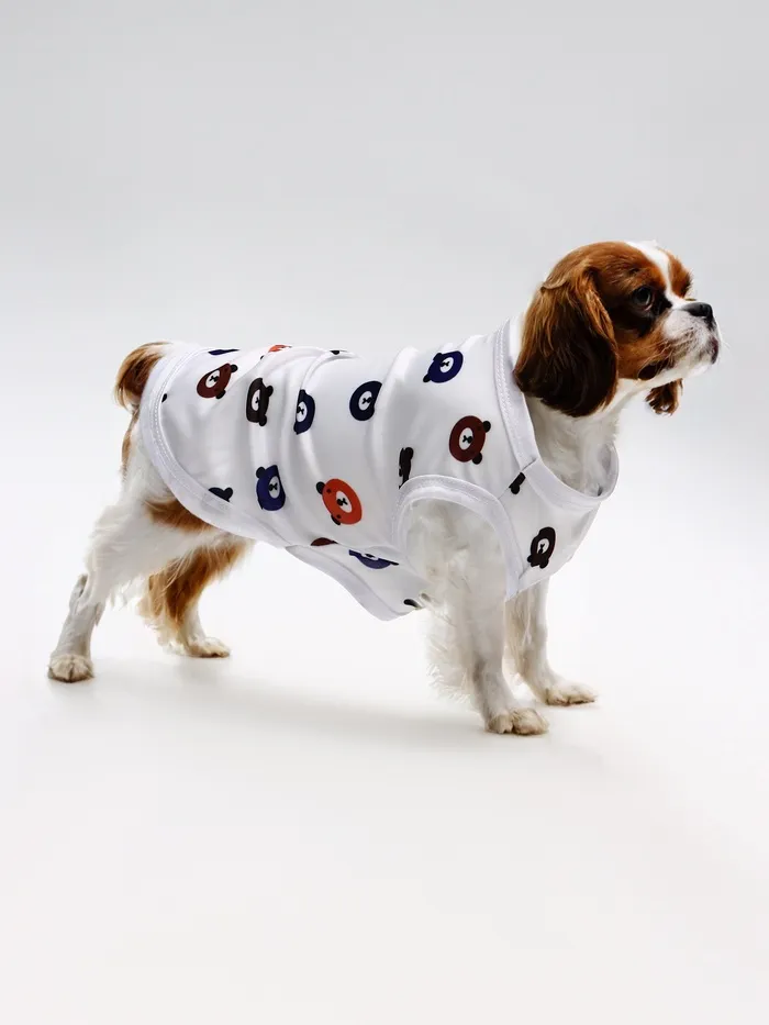 Белая футболка с милым принтом мишки в размере M — идеальный выбор для питомцев с обхватом груди 42 см и длиной спины 30 см. Простое решение для создания стильного образа.