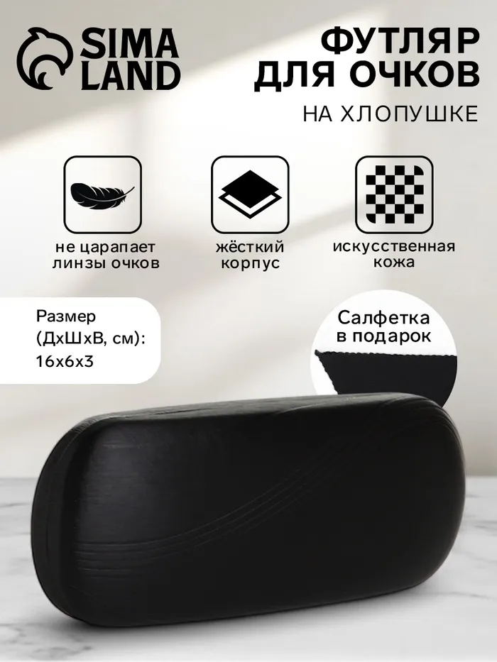Элегантный футляр для очков, который сочетает в себе стиль и практичность. Изготовлен из искусственной кожи, он обладает жёстким корпусом для надежной защиты ваших очков. Черный цвет подчеркивает утонченность и подходит как мужчинам, так и женщинам. Удобная хлопушка-застежка обеспечивает легкость в использовании.