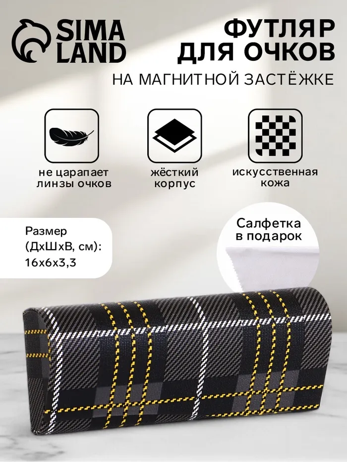 Футляр для очков на магните, в клетку, размер 16×6×3.3 см, чёрный/жёлтый — Характеристики