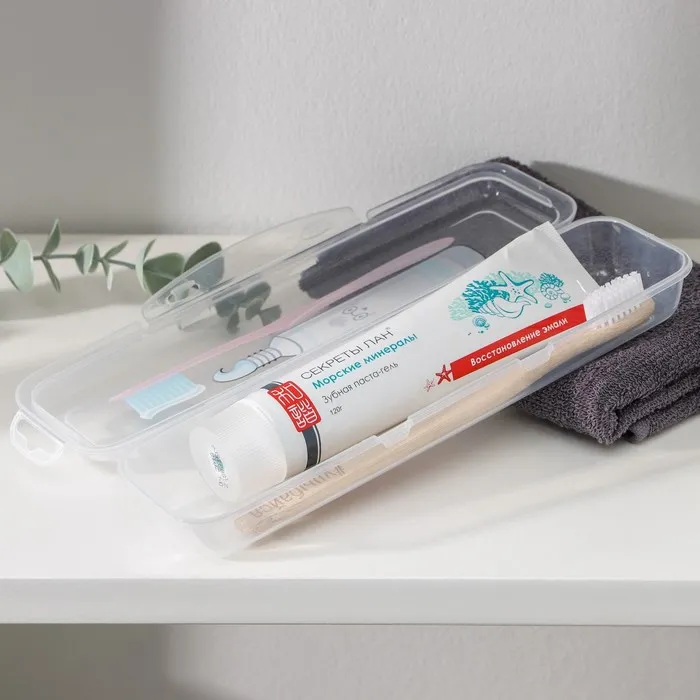 - Он удобен и практичен: крышка открывается лёгким нажатием на корпус, вместит зубную пасту, щётку и даже зубную нить.