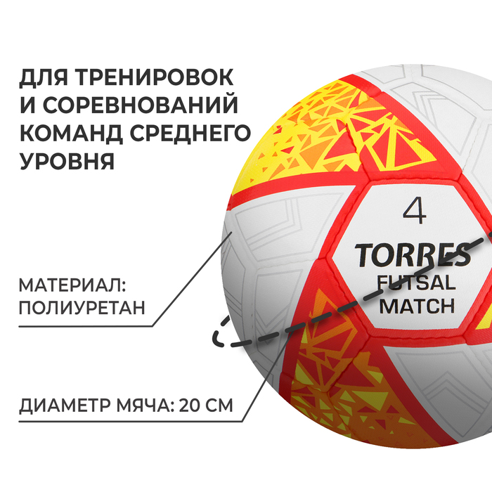 Мяч серии Futsal Match в обновлённом дизайне предназначен для игр и тренировок команд и клубов среднего уровня. Рекомендуется для залов с различными типами покрытий и открытых мини-футбольных площадок с твёрдыми, жёсткими покрытиями.