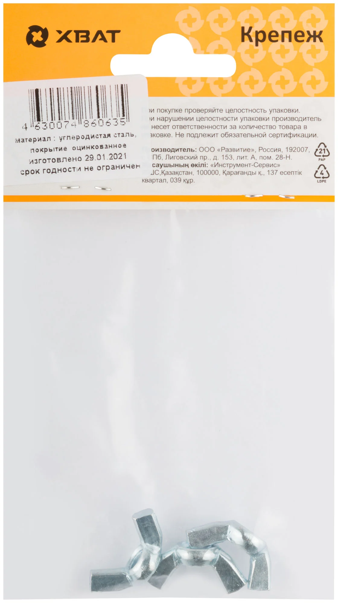 Гайка изготовлена из конструкционной стали и покрыта белым цинком, что обеспечивает долговечность и защиту от коррозии. Шестигранная форма с «барашками» позволяет легко затягивать и ослаблять соединение вручную, без использования инструментов.