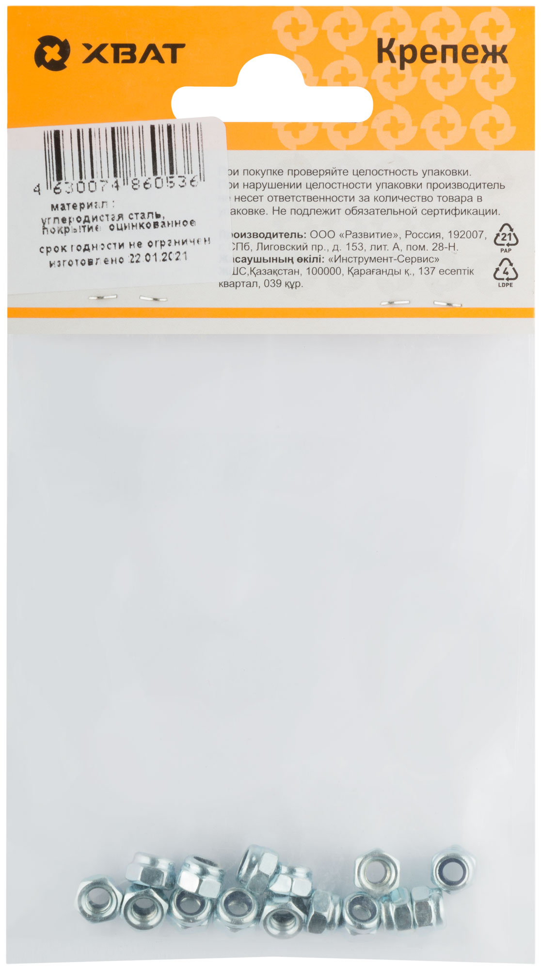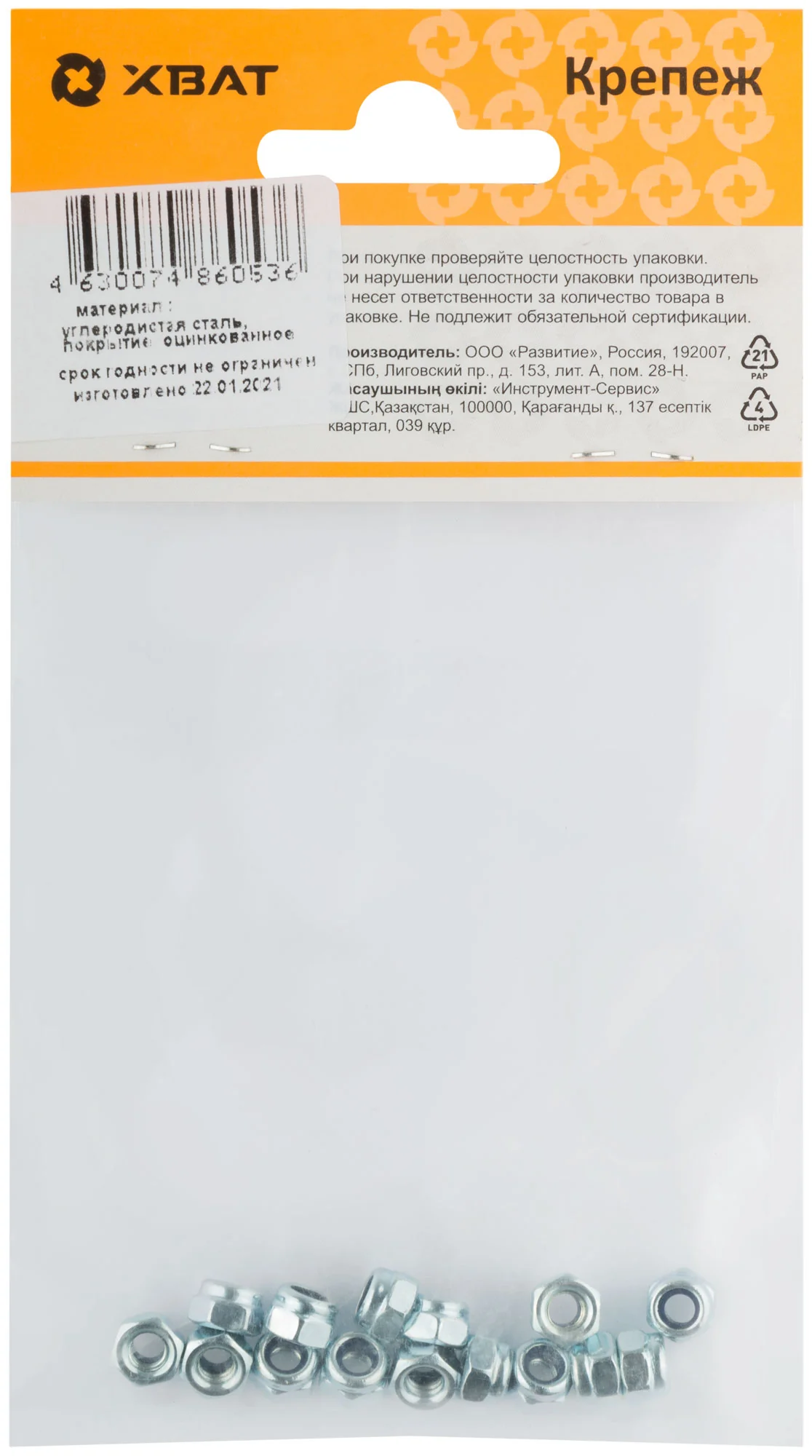 Гайка изготовлена из прочной стали с оцинкованным покрытием, что обеспечивает её долговечность и устойчивость к коррозии. Нейлоновая вставка обеспечивает дополнительное сцепление и герметичность резьбы, исключая необходимость в дополнительных стопорных шайбах или гроверах.