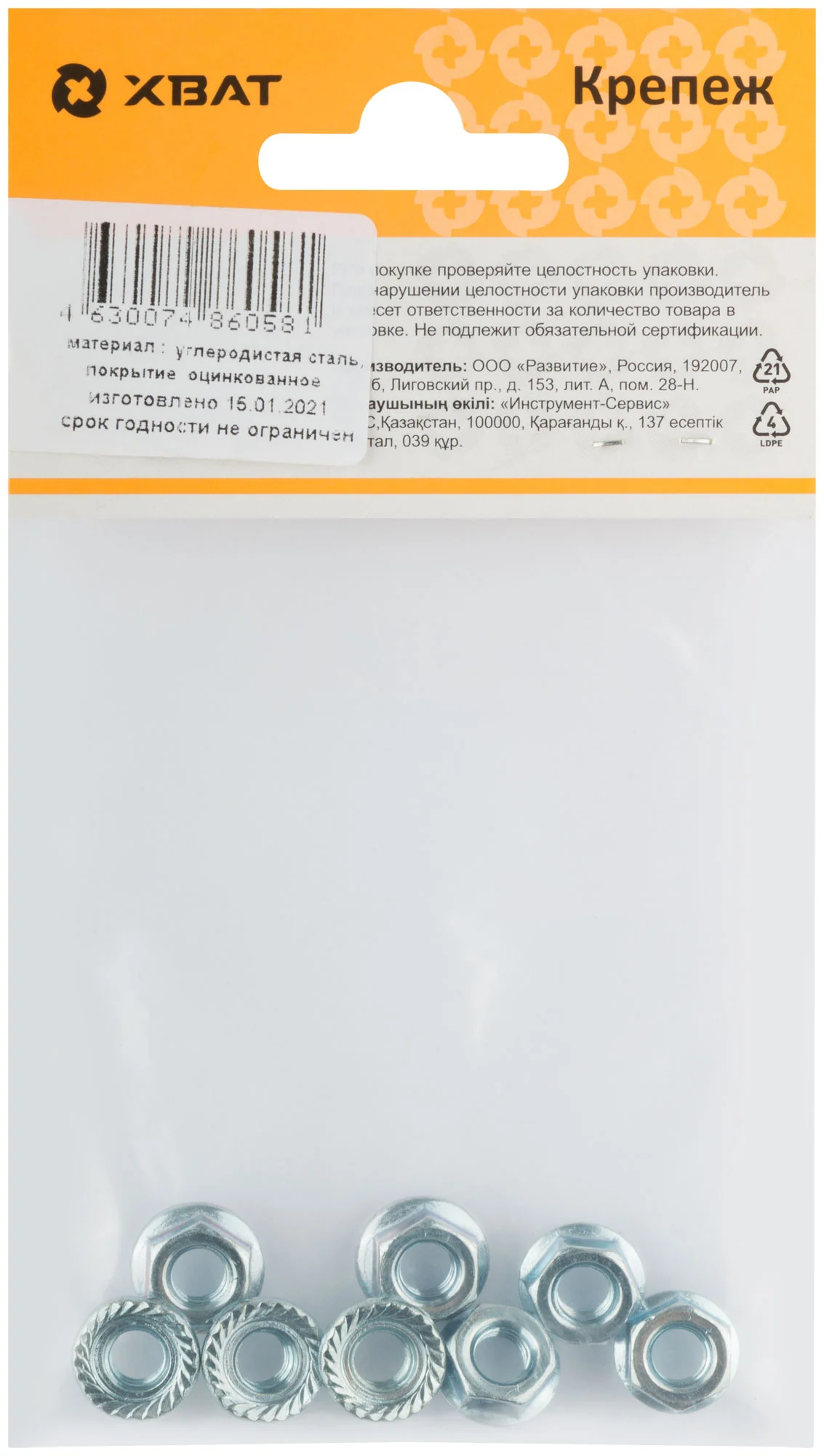 Эта гайка изготовлена из конструкционной стали с покрытием из белого цинка, что обеспечивает долговечность и устойчивость к коррозии. В упаковке содержится 8 штук, что удобно для небольших и средних объемов работ.