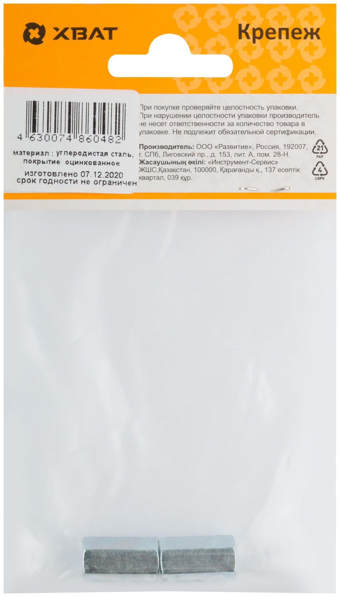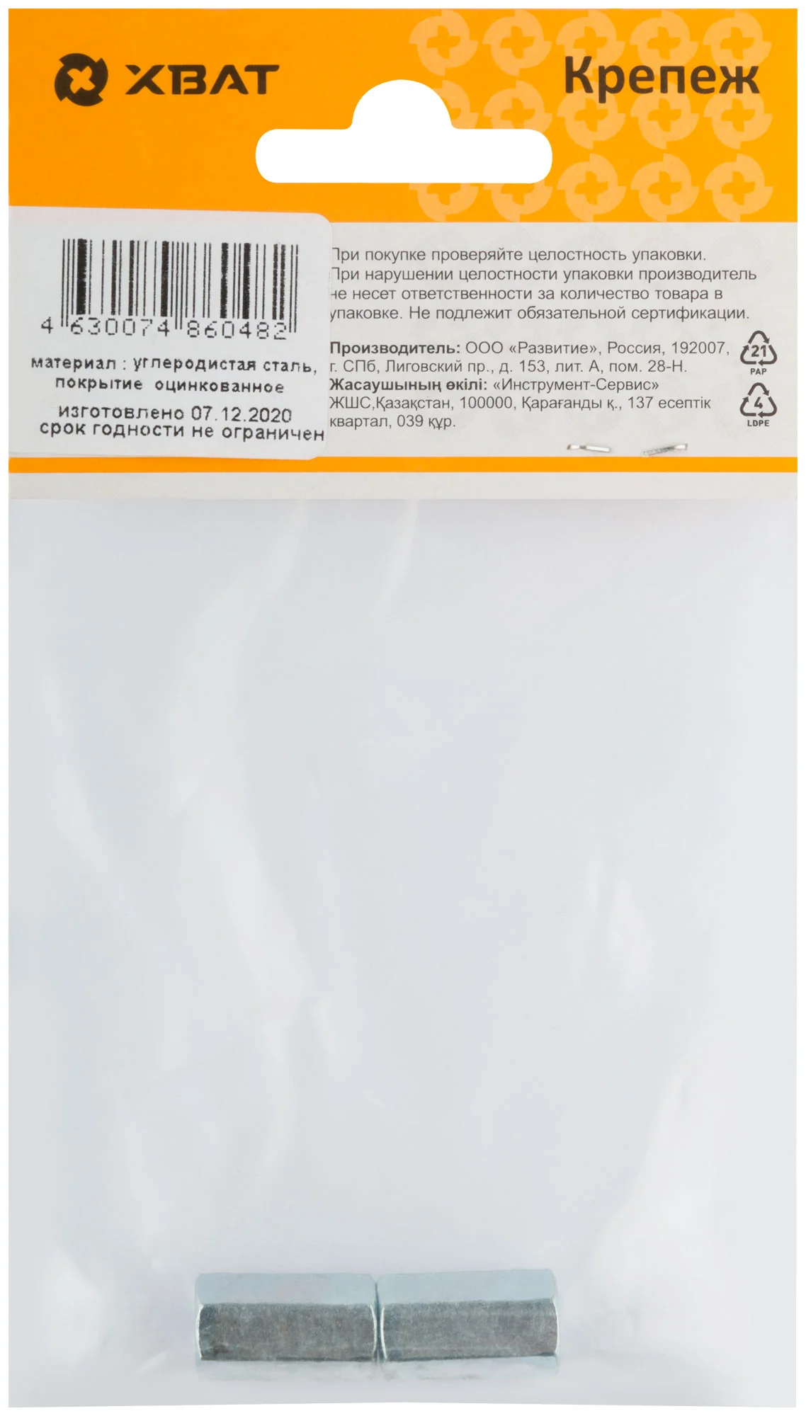 Гайка изготовлена из конструкционной оцинкованной стали, что гарантирует ее долговечность и устойчивость к коррозии. Длина гайки составляет примерно три ее диаметра, что обеспечивает дополнительную прочность соединения.