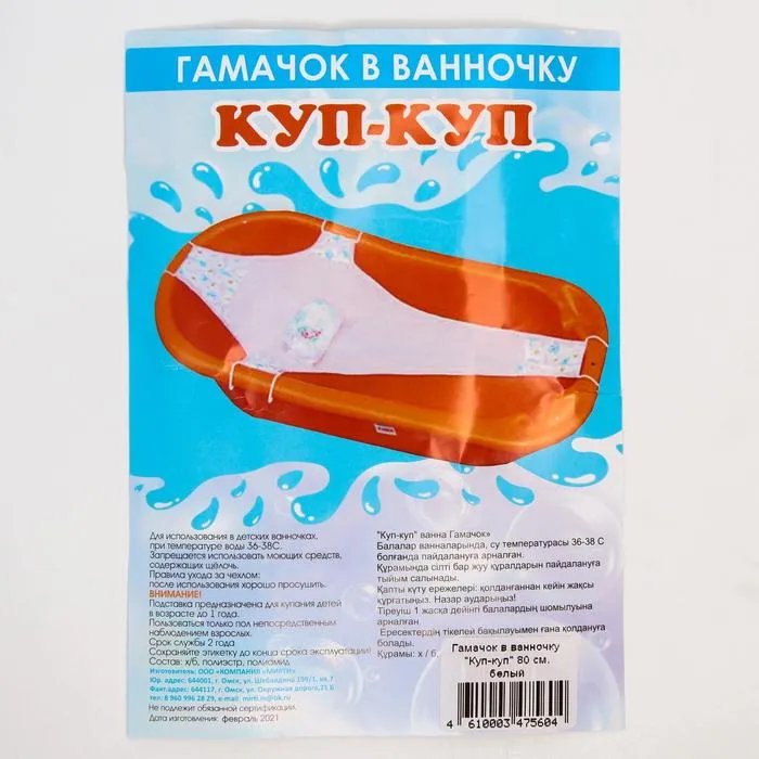 Гамачок обеспечивает комфортное и надёжное положение ребёнка во время водных процедур. Изделие крепится на ванночку за крючки, поддерживает кроху во время купания, освобождая мамины руки для мытья малыша.