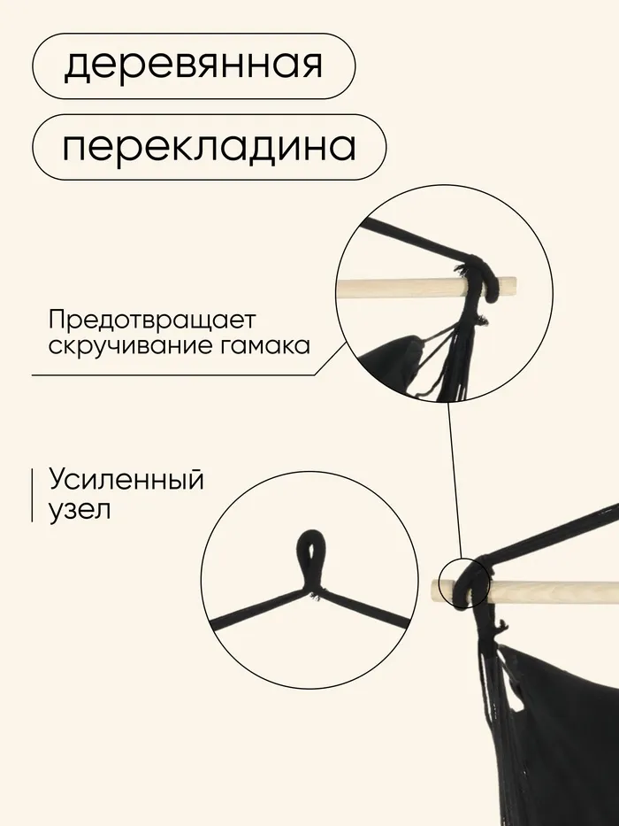 Подвесьте гамак-кресло в зоне отдыха и наслаждайтесь комфортной обстановкой. Мерное покачивание в гамаке позволит максимально расслабиться и насладиться отдыхом.