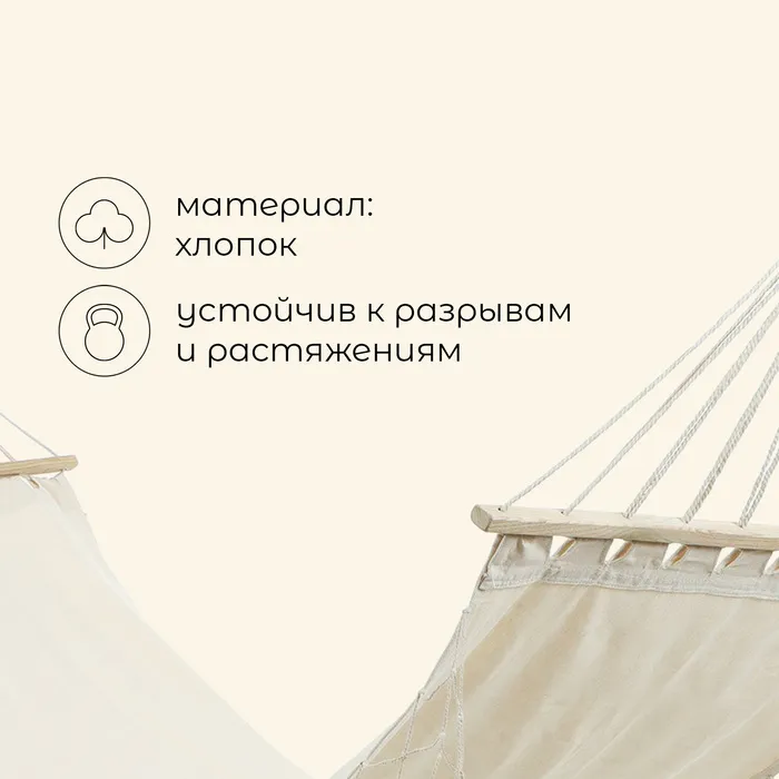 • Материал гамака отличается устойчивостью к механическим воздействиям: разрывам, растяжению, истиранию, не пропускает влагу и защищает от ветра.
