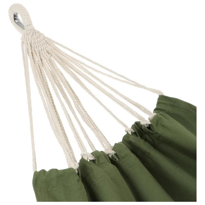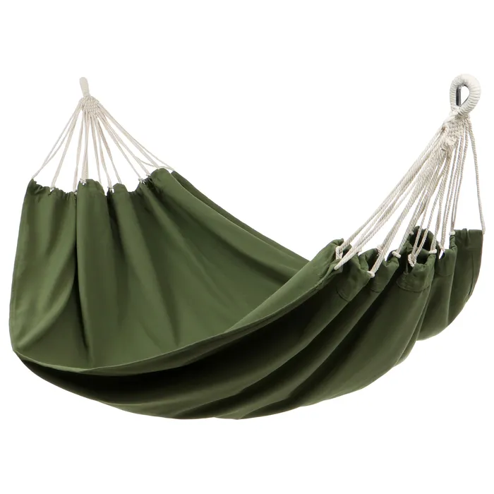 Износостойкий гамак из канваса подойдёт для качания, сна или отдыха на природе. Прочный материал выдерживает высокую нагрузку до 200 кг за счет равномерного геометрического переплетения нитей. Благодаря компактному размеру и простой конструкции он удобен в хранении, транспортировке и установке.