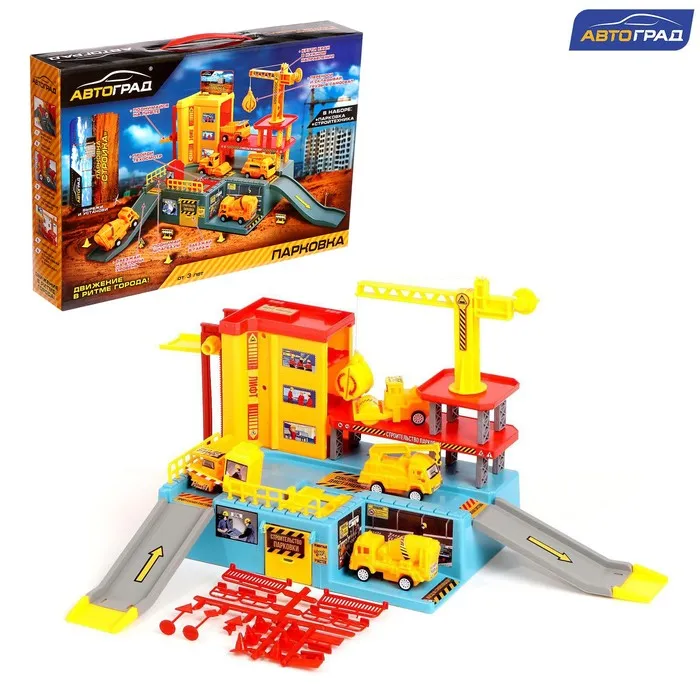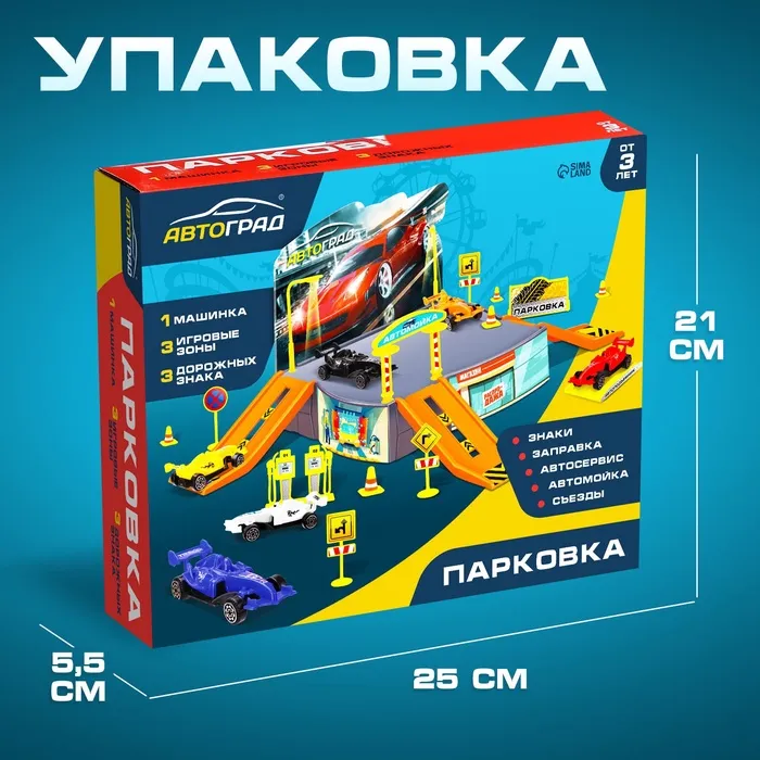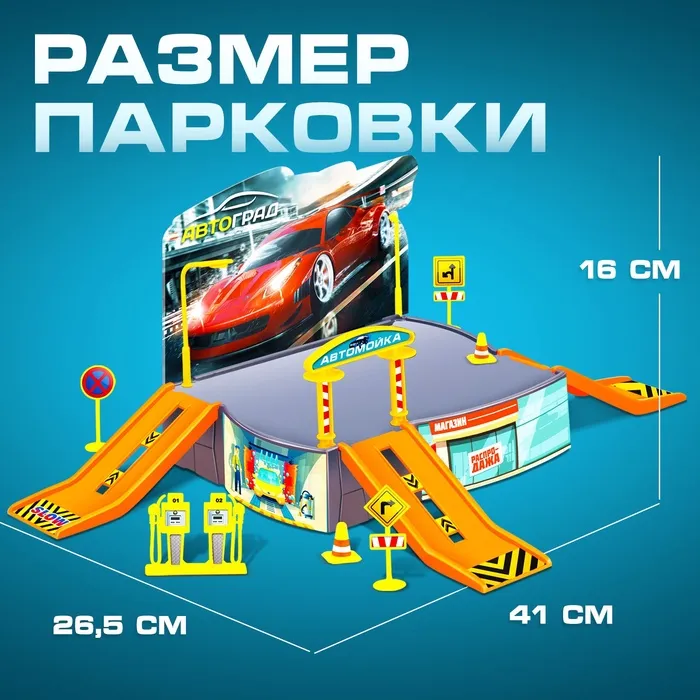 Большое пространство для парковки, автосервис, автомойка и заправка сделают игру с машинками увлекательней и разнообразней, а наличие дорожных знаков и указателей поможет ребёнку освоить основные правила дорожного движения.