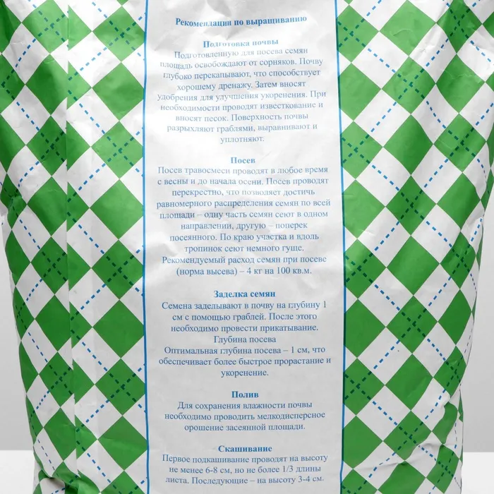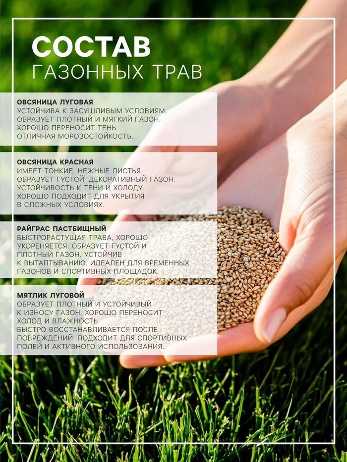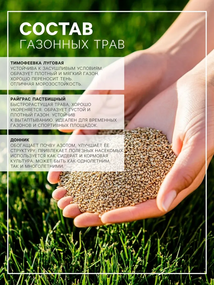 Состав: райграс пастбищный - 50%, тимофеевка луговая - 20%, овсяница луговая - 20%, райграс однолетний - 10%.