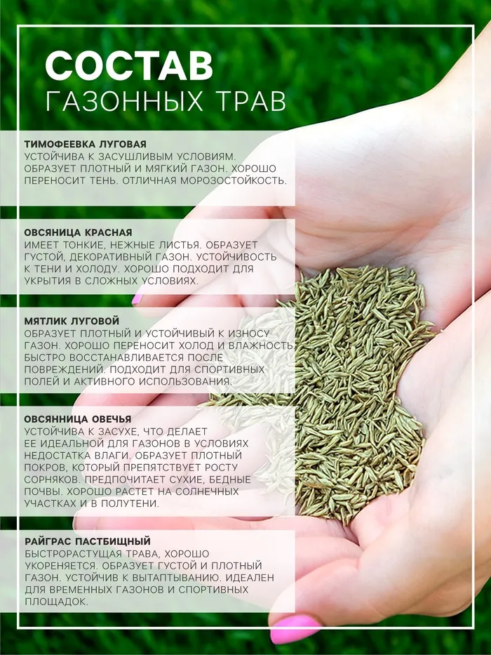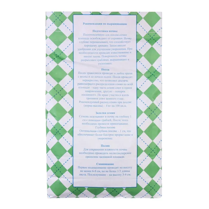 Семена газонной травосмеси. Норма высева 4 кг на 100 кв.м. Глубина заделки семян 1 см.