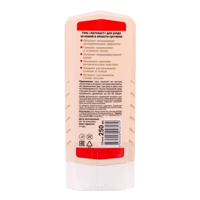 Гель «Активист» - обладает охлаждающе-разогревающим эффектом, снимает напряжение и усталость мышц, улучшает микроциркуляцию крови, оказывает противовоспалительное действие, ускоряет рассасывание гематом и отёков, улучшает эластичность стенок сосудов.