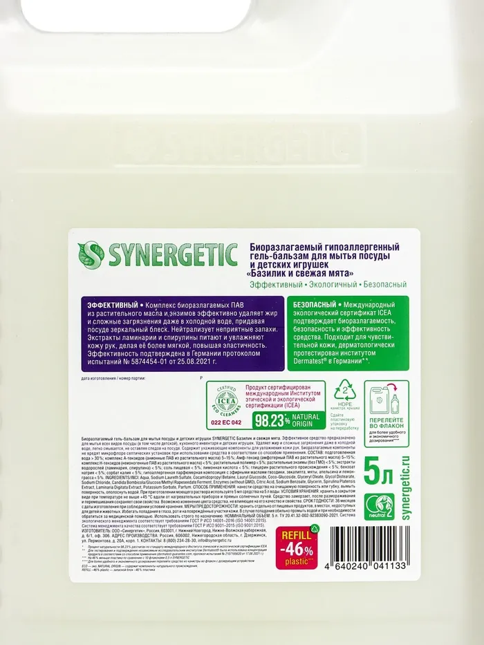 Гель-бальзам для мытья посуды Synergetic «Базилик и свежая мята», 5 л — Характеристики