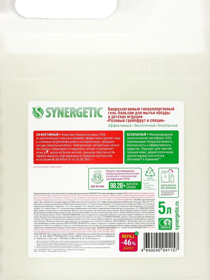 Гель-бальзам для мытья посуды Synergetic «Розовый грейпфрут и специи», 5 л — Характеристики