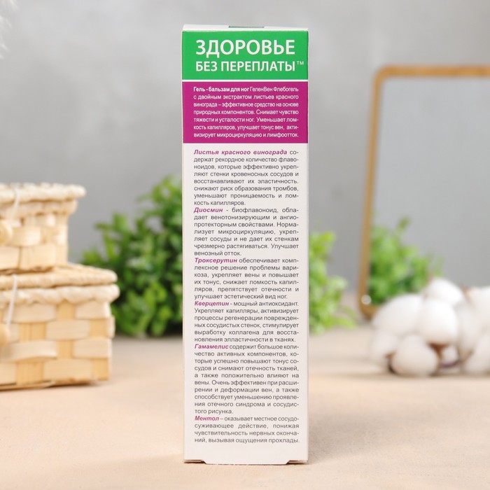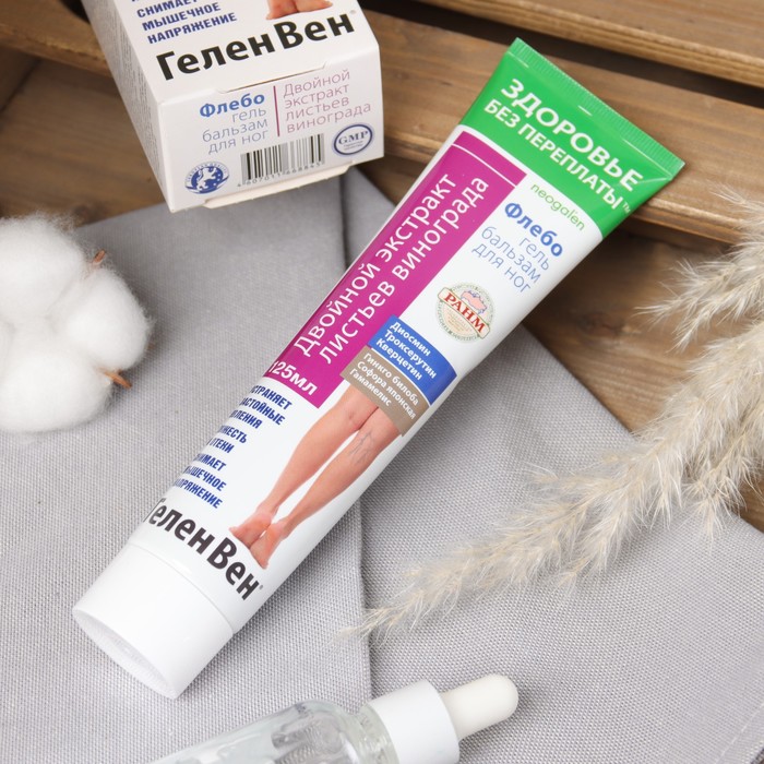 Гель-бальзам "Вен Флебогель" с двойным экстрактом листьев винограда помогает укрепить сосуды, снять усталость и тяжесть в ногах, а также улучшить состояние кожи. Попробуйте этот гель-бальзам для облегчения нагрузки на ноги и достижения ощущения свежести и комфорта.