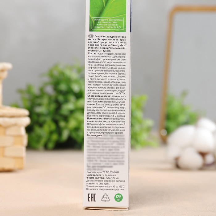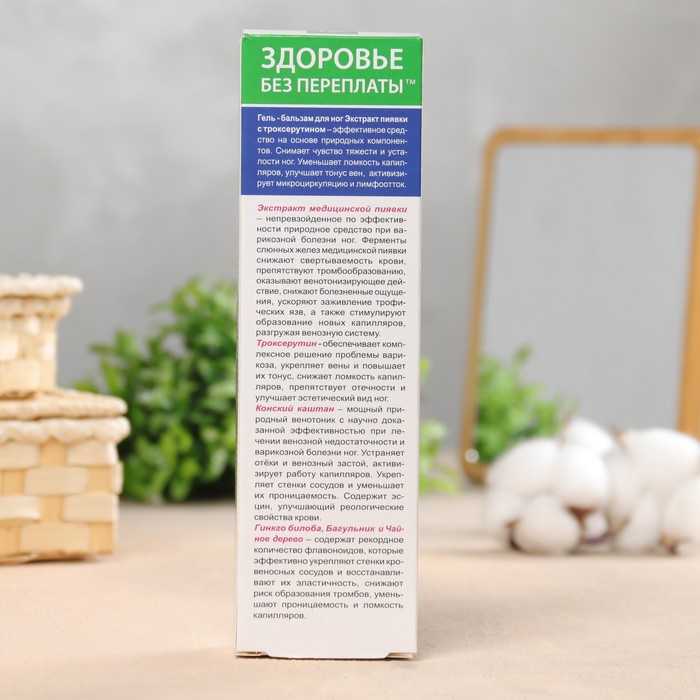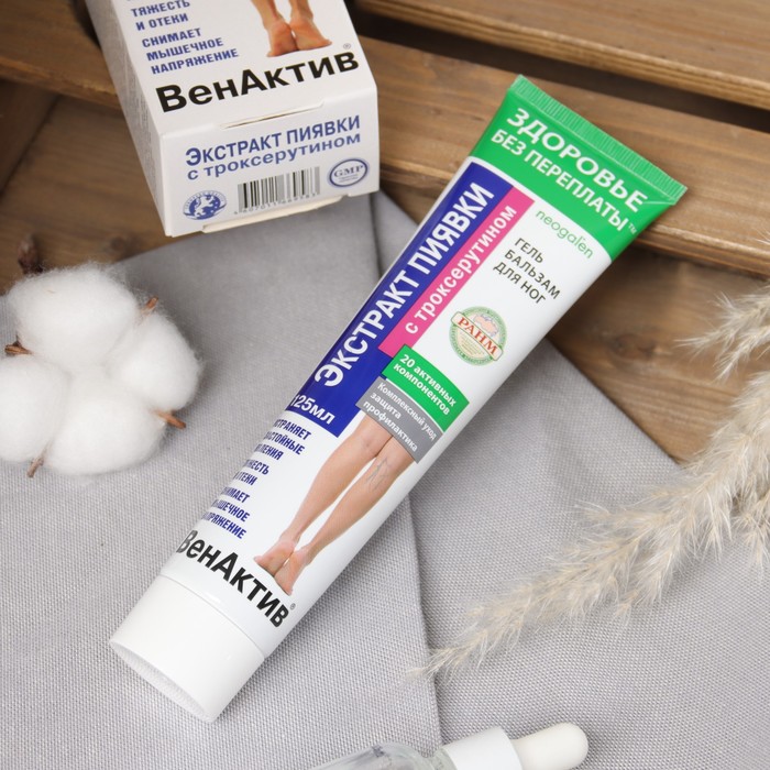 Эффективное средство на основе натуральных биоактивных компонентов. Способствует устранению усталости и тяжести в ногах, уменьшению вечерних отеков. Оказывает комплексное положительное действие. Способствует активизации функции венозных клапанов, микро циркуляции и лимфооттока. Снижает риск возникновения трофических изменений кожи (сухость, шелушение, истонченность). Питает, смягчает, увлажняет и освежает кожу ног. Эффективность и безопасность геля-бальзама для ног обеспечена синергизмом активных природных компонентов. Медицинская пиявка способствуют образованию новых капилляров, в результате чего улучшается микроциркуляция крови и разгружается венозная система. Ферменты пиявки ускоряют заживление трофических язв, улучшают состояние кожи. Троксерутин обеспечивает комплексное решение проблемы варикоза, укрепляет вены и повышает их тонус, снижает ломкость капилляров, препятствует отечности и улучшает эстетический вид ног.