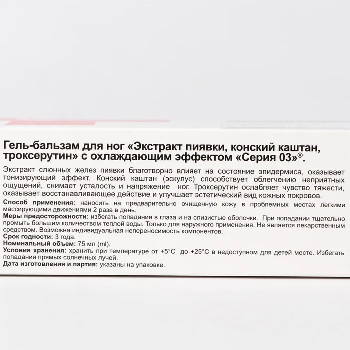Гель-бальзам «Серия 03», охлаждающий, экстракт пиявки, конский каштан, троксерутин, 75 мл — Характеристики