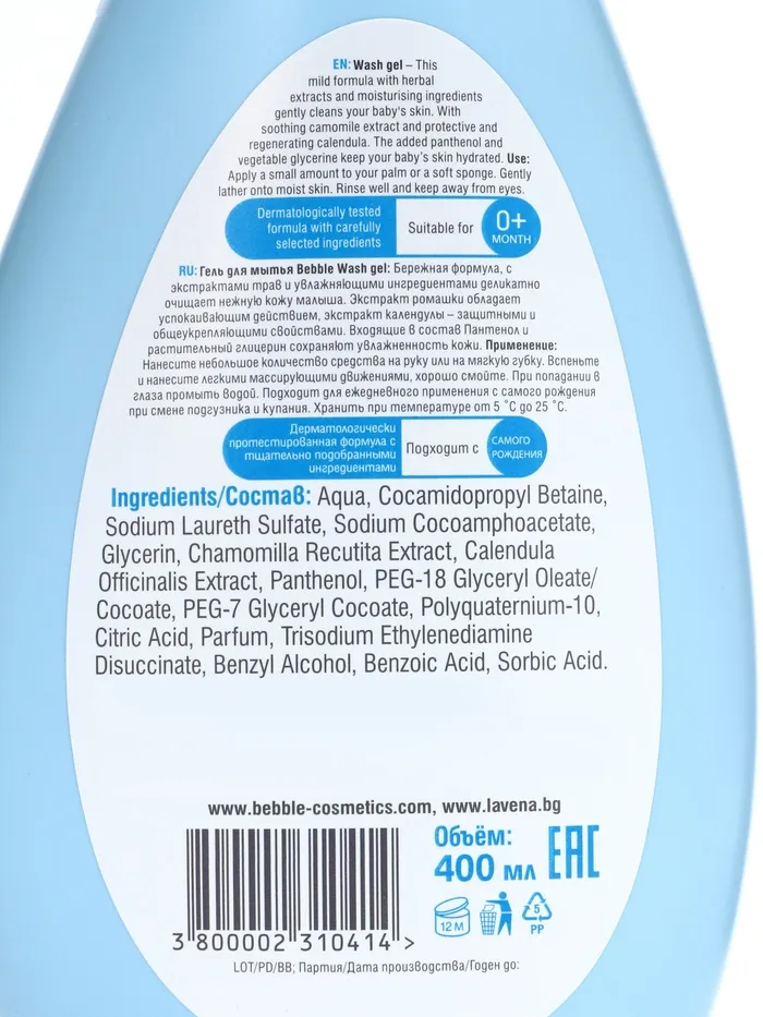 Состав: Aqua, Cocamidopropyl Betaine, Sodium Laureth Sulfate, Sodium Cocoamphoacetate, Glycerin, Chamomilla Recutita Extract, Calendula Officinalis Extract, Panthenol, PEG-18 Glyceryl Oleate/Cocoate, PEG-7 Glyceryl Cocoate, Polyquaternium-10, Citric Acid, Parfum, Trisodium Ethylenediamine Disuccinate, Benzyl Alcohol, Benzoic Acid, Sorbic Acid.