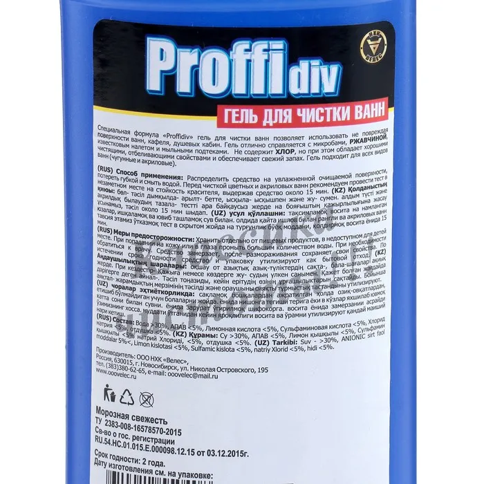 Специальная формула гель для чистки ванн позволяет использовать не повреждая поверхности ванн, кафеля, душевых кабин. Гель отлично справляется с микробами, ржавчиной, известковым налетом и мыльными подтеками. Не содержит хлор, но при этом обладает хорошими чистящими, отбеливающими свойствами и обеспечивает свежий запах. Гель подходит для всех видов ванн (чугунные и акриловые).