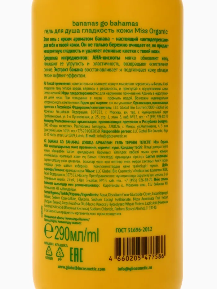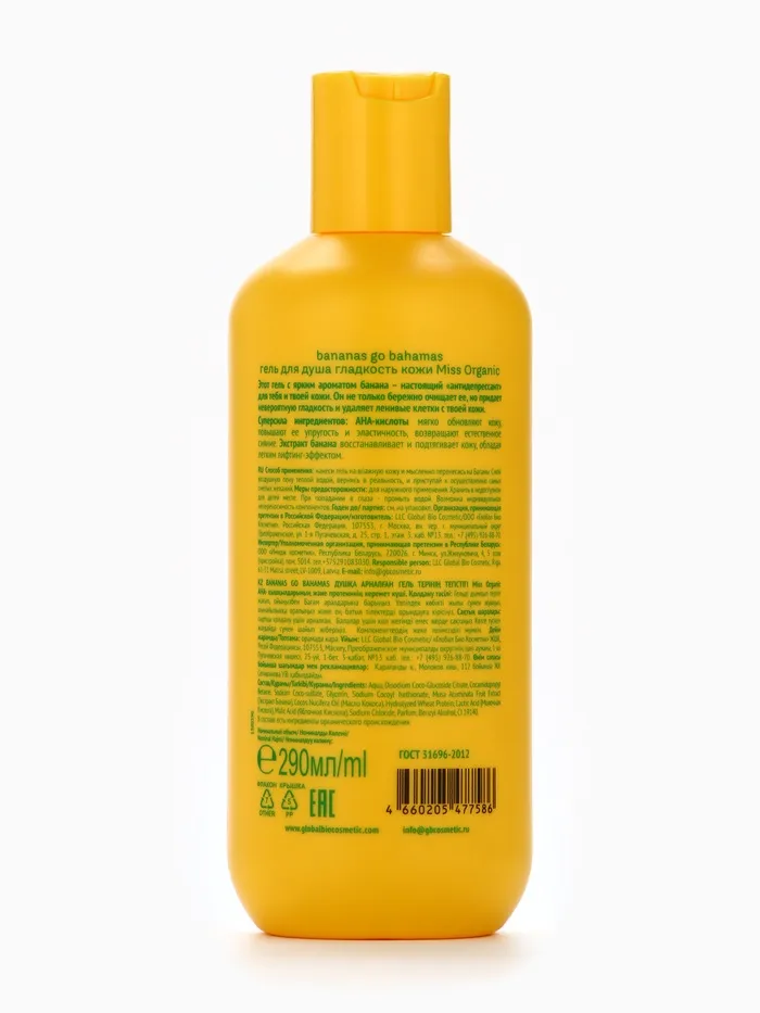 Гель для душа Bananas go bahamas, гладкость кожи, 290 мл, Miss Organic — Характеристики