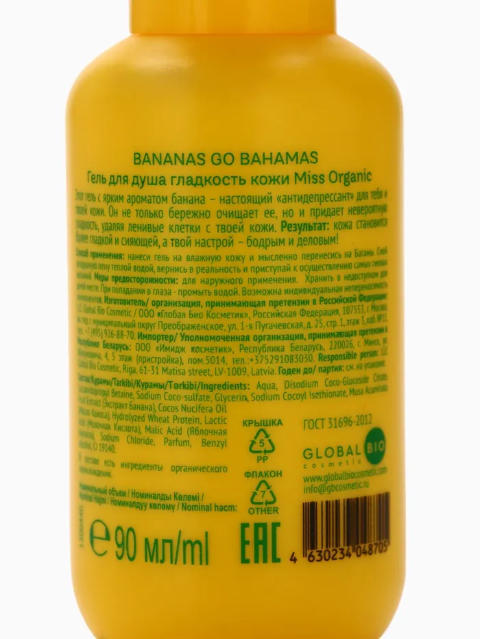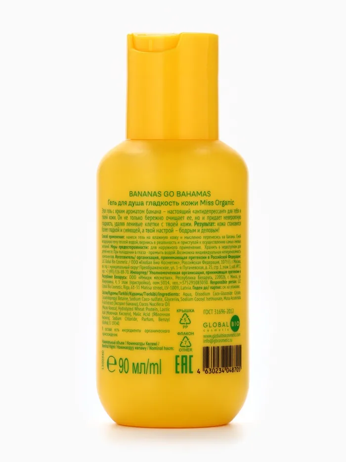 Состав: Aqua, Disodium Coco-Glucoside Citrate, Cocamidopropyl Betaine, Sodium Coco-sulfate, Glycerin, Sodium Cocoyl Isethionate, Musa Acuminata Fruit Extract (Экстракт Банана), Cocos Nucifera Oil (Масло Кокоса), Hydrolyzed Wheat Protein, Lactic Acid (Молочная Кислота), Malic Acid (Яблочная Кислота), Sodium Chloride, Parfum, Benzyl Alcohol, CI 19140.