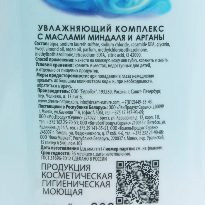 Состав: aqua, sodium laureth sulfate, sodium chloride, cocamide DEA, glycerin, sweet almond oil, argan oil, parfum, methylchloroisothiazolinone, methylisothiazolinone,tetrasodium EDTA, citric acid, Cl 42090.