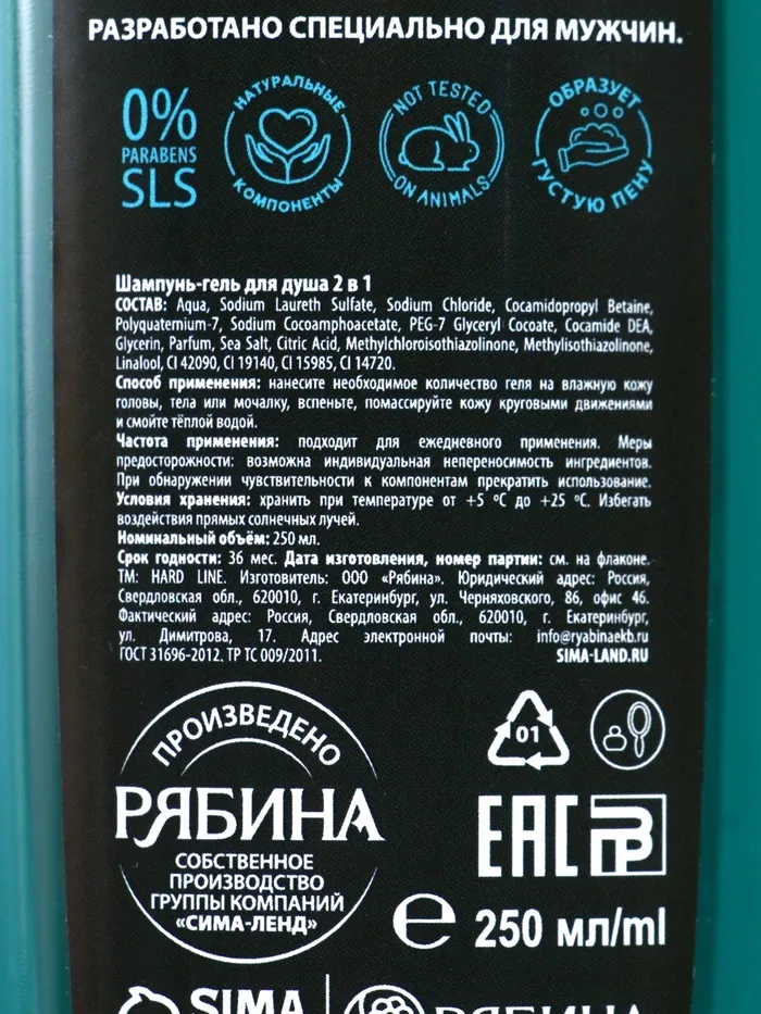 Гель для душа и шампунь 2 в 1 «Морские минералы», 250 мл, аромат бергамот и специи, HARD LINE — Характеристики