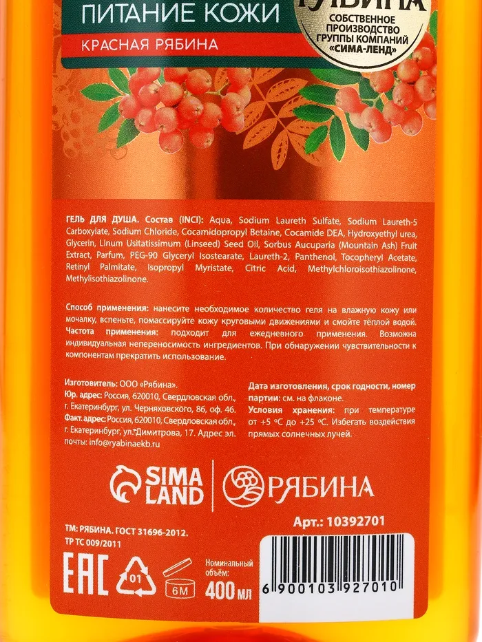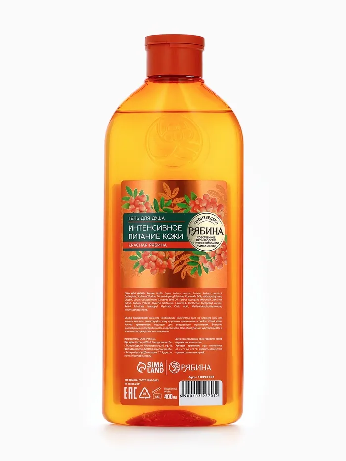 Гель для душа, интенсивное питание кожи, аромат рябины, 400 мл, Рябина — Характеристики