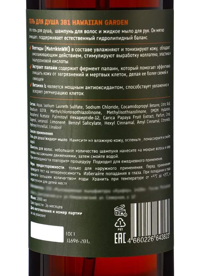 Состав: Aqua, Sodium Laureth Sulfate, Sodium Chloride, Cocamidopropyl Betaine, Citric Acid, Disodium EDTA, Methylchloroisothiazolinone, Methylisothiazolinone, DMDM Hydantoin, Tocopheryl Acetate, Palmitoyl Hexapeptide-12, Carica Papaya Fruit Extract, Parfum, Citral, Eugenol, Geraniol, Limonene, Benzyl Salicylate, Hexyl Cinnamal, Amyl Cinnamal, Citronellol, Hydroxycitronellal, Linalool.