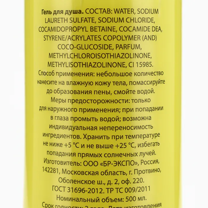 СОСТАВ: WATER, SODIUM LAURETH SULFATE, SODIUM CHLORIDE, COCAMIDOPROPYL BETAINE, COCAMIDE DEA, STYRENE/ACRYLATES COPOLYMER (AND) COCO-GLUCOSIDE, PARFUM, METHYLCHLOROISOTHIAZOLINONE, METHYLISOTHIAZOLINONE, CI 15985.