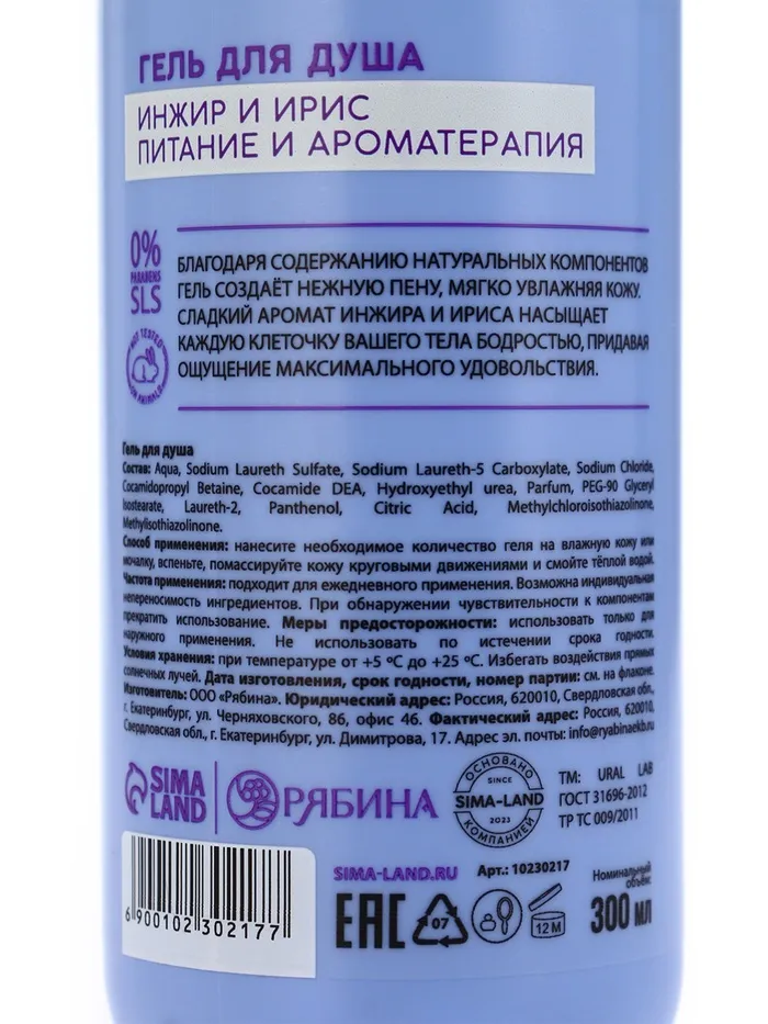 Гель для душа женский, 300 мл, аромат инжир и ирис, URAL LAB — Характеристики