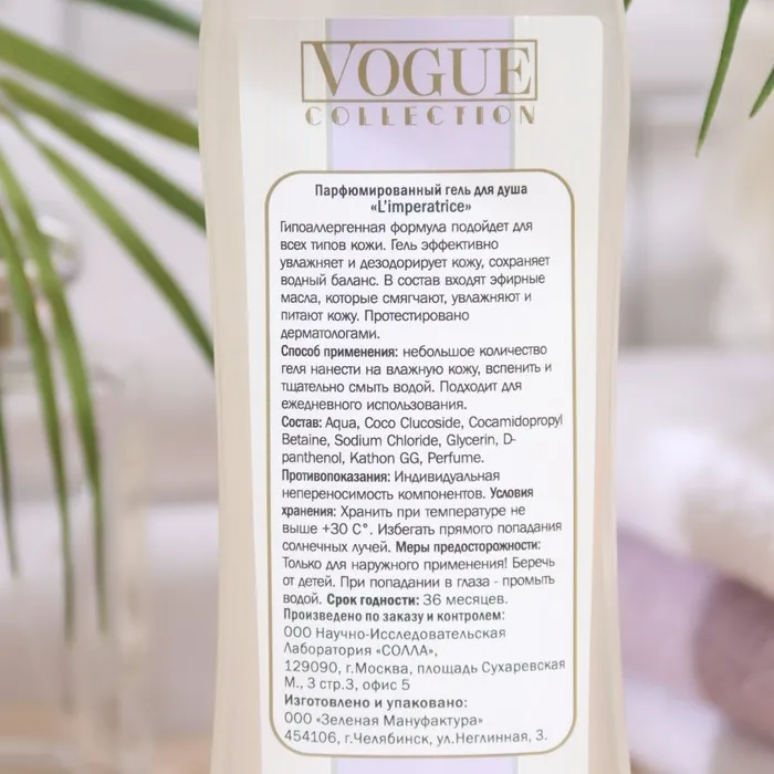 Женский гель для душа «L’Imperatrice» обладает необычайной стойкостью аромата - оставит выразительный шлейф на 1-2 часа. Гипоаллергенная формула подойдёт для всех типов кожи. Гель эффективно увлажняет кожу, сохраняет водный баланс. В состав входят эфирные масла, которые смягчают и питают кожу.
